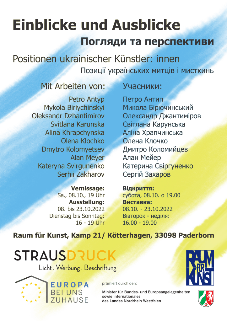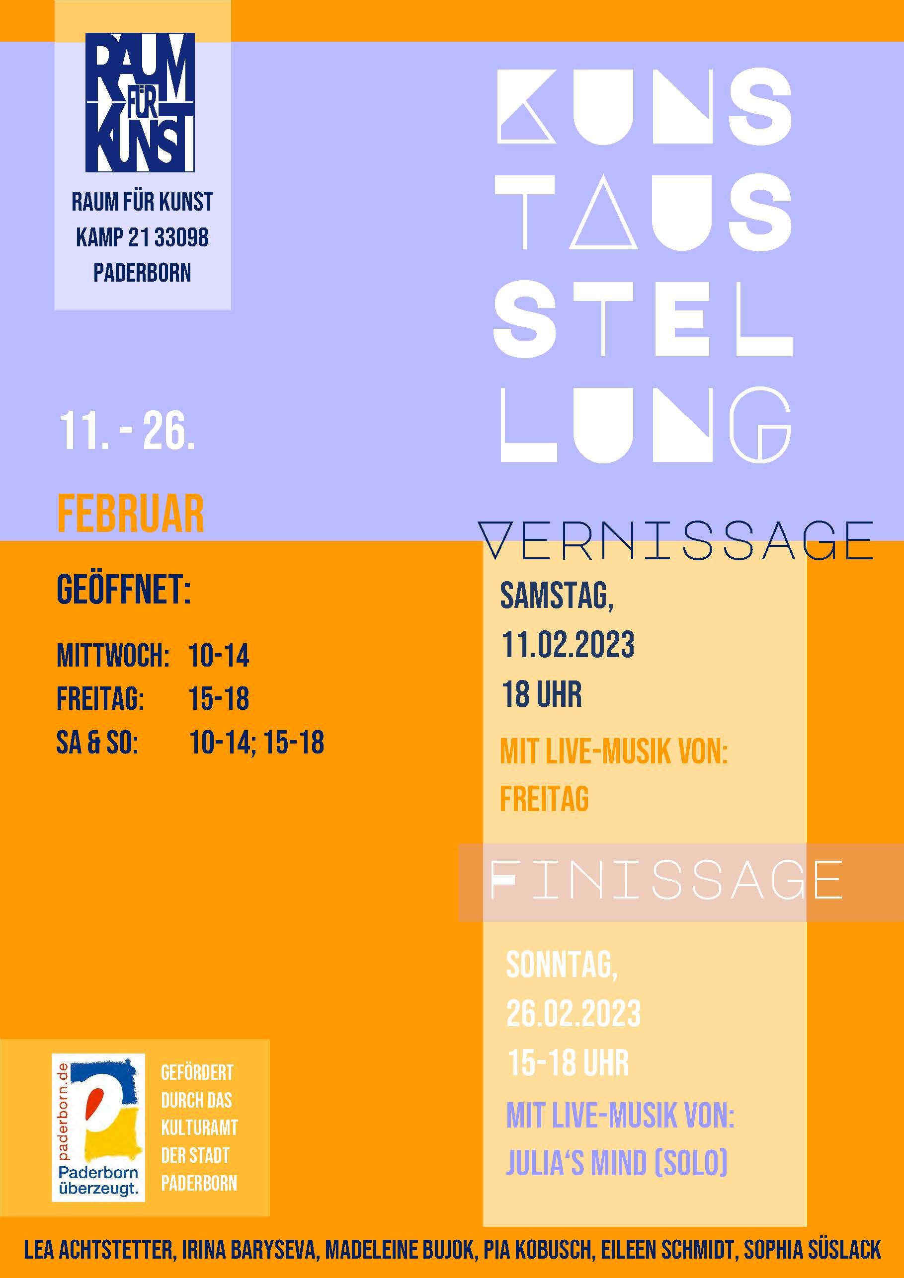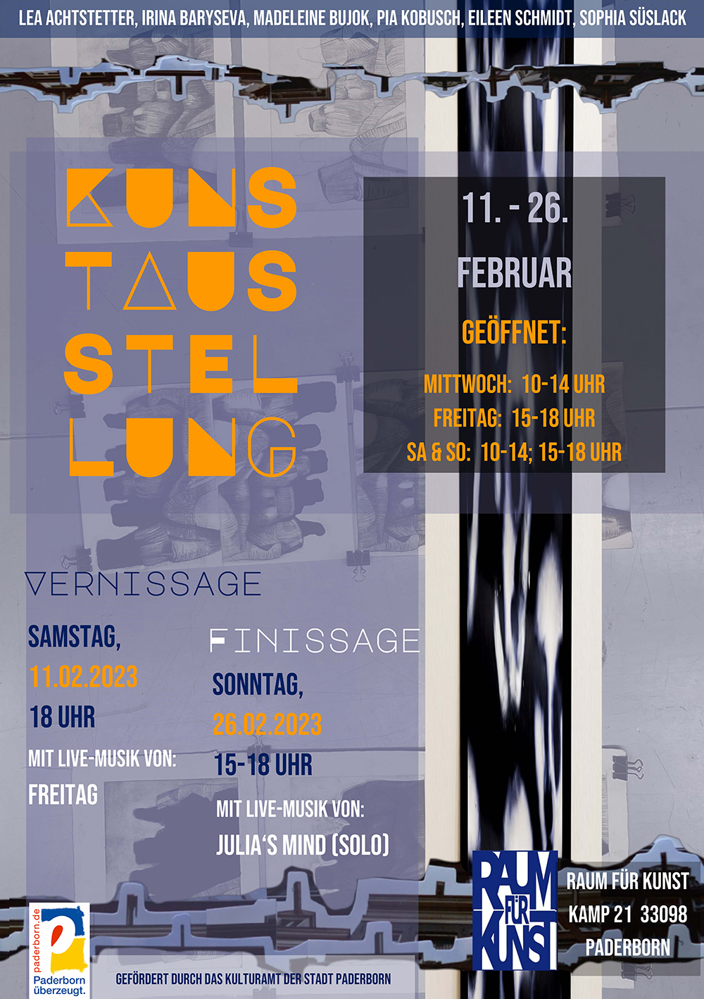 Die Vernissage der Ausstellung mit Werken beider Künstler findet am Samstag, den 01.04.2023 ab 17:00 Uhr im Raum für Kunst (Kötterhagen / Kamp 21) in Paderborn statt, am Sonntag, den 02.04. in der Zeit von 11 :00 bis 20:00 Uhr die Finissage.