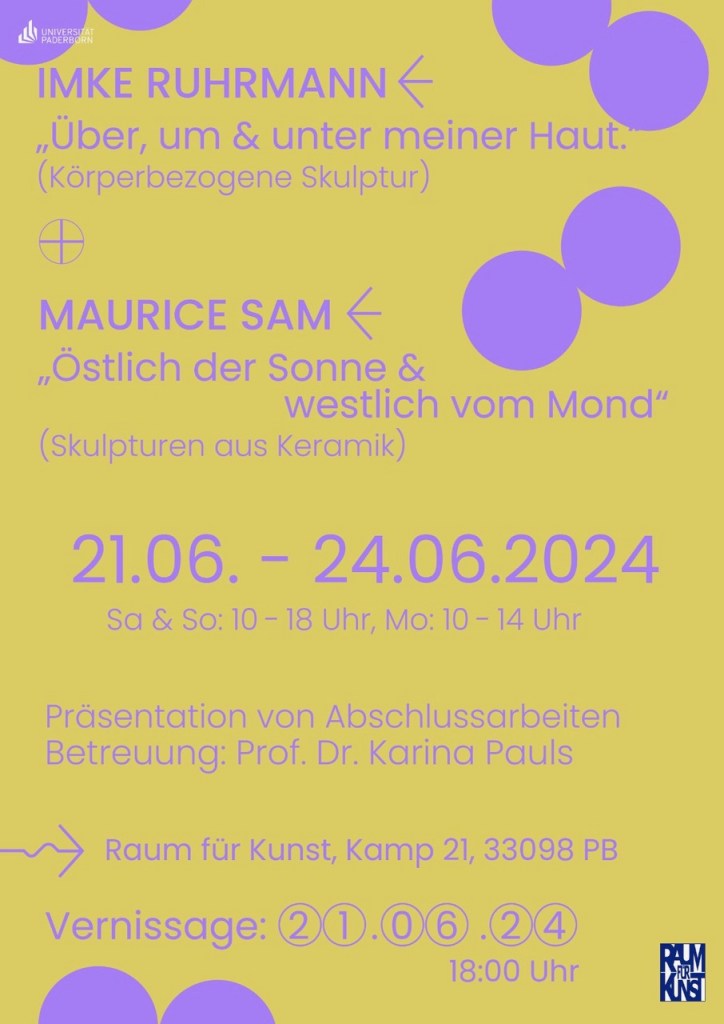 Marice Sam „Östlich der Sonne&westlich vom Mond“Die Ausstellung präsentiert die bildhauerischen Abschlussarbeiten von Imke Ruhrmann mit dem Titel “Über, um & unter meiner Haut” (Körperbezogene Skulptur) und von Maurice Sam, „Östlich der Sonne&westlich vom Mond“ (Skulpturen aus Keramik), Student*innen der Universität Paderborn.