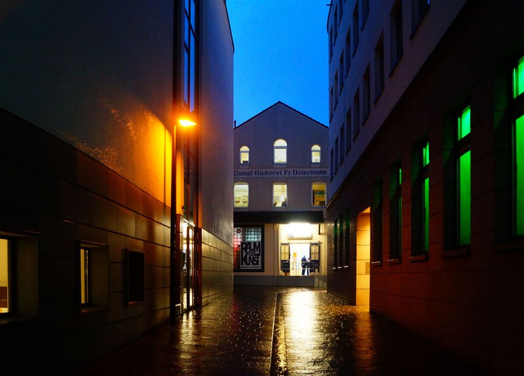 Zwischen zahlreichen gläsernen Neubauten im Herzen der Stadt Paderborn steht der Altbau des ‚Raum für Kunst‘ – ein Atelierhaus und Ausstellungsbetrieb im Gebäude der ehemaligen Dampf-Bäckerei der Familie Ostermann. Das unkonventionelle Gebäude sticht mit architektonischen Besonderheiten, denkmalgeschützten Elementen, dem Zahn der Zeit und etlichen Spuren der KünstlerInnen, die seit 1991 dort arbeiten und ausstellen, aus der unmittelbaren Umgebung heraus. Die Studierenden ließen sich durch diesen einzigartigen Ort inspirieren, um ortsspezifische Skulpturen zu entwickeln und schließlich vor Ort zu präsentieren.