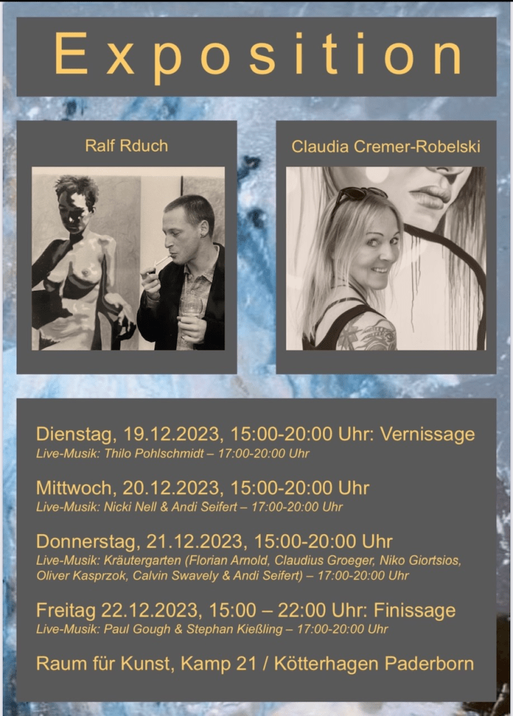 Live Acts: An jedem Ausstellungstag findet in der Zeit zwischen 17:00 und 20:00 Uhr ein musikalisches Live-Programm statt! –> Dienstag (19.12.): Thilo Pohlschmidt –> Mittwoch (20.12.): Nicki Nell & Andi Seifert –> Donnerstag (21.12.): Kräutergarten (Florian Arnold, Claudius Groeger. Niko Giortsios, Oliver Kasprzok, Calvin Swavely & Andi Seifert) –> Freitag (22.12.): Paul Gough und Stephan Kießling