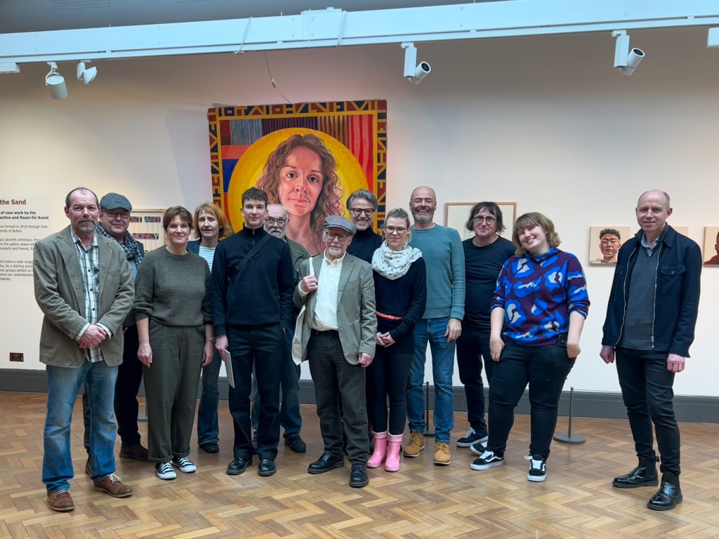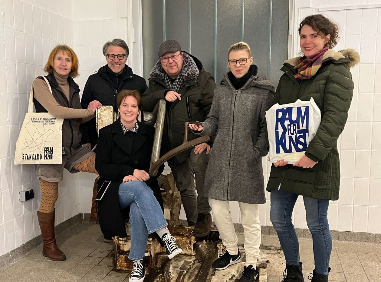 Vom 16.02. – 18.02. 2024 besuchten sieben Ateliermitglieder vom Raum für Kunst Paderborn e. V., von insgesamt elf ausstellenden Künstlern, ihre britischen Künstlerfreunde vom STANDARD-Collectiv in Bolton. Bereits zum 7. Mal fand dieser KünstlerInnenaustausch statt, jedes Mal begleitet von einer gemeinsamen Ausstellung zu einem aktuellem Thema. Mit über einem Jahr Vorbereitung (Ausstellungsraum, Titelfindung, Förderung, Katalog, Zollbestimmungen) haben beide Künstlerkollektive mit dem Thema Lines in the sand eine inhaltliche Baseline gefunden. Diese lotet in den ausgestellten Bildwerken zeitaktuell persönliche und globale Verbindungen aus.