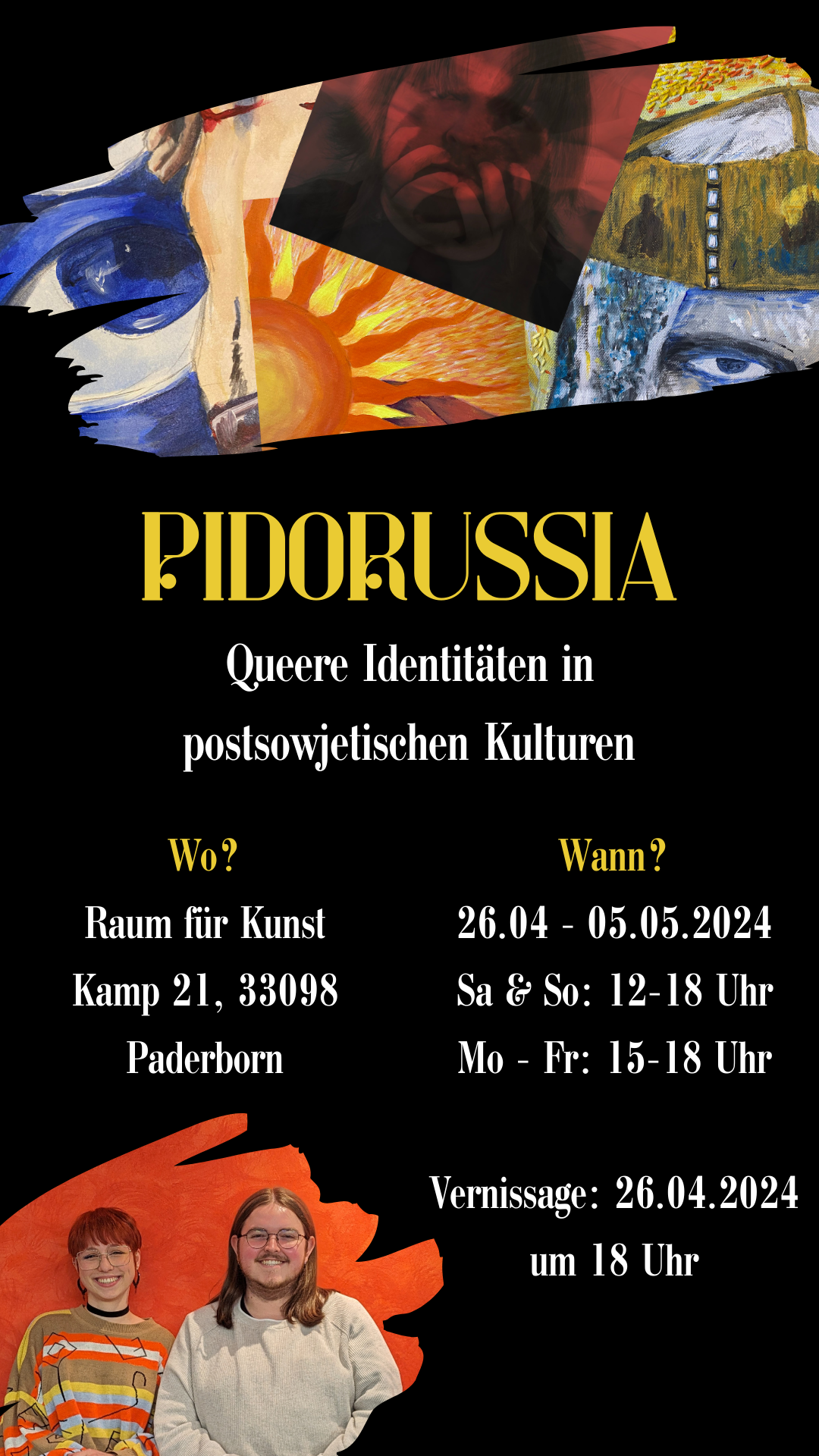 Durch die Hypervernetzung in unserer Gesellschaft trifft man auf diverse Kulturen und Menschen. Wir leben gemeinsam und formen gemeinsam unsere Straßen, Städte und Länder. Deshalb sind auch Sie ein Teil von uns, und wir von Ihnen. Daria und Nicky, queere Künstler*innen und Studierende der Uni Paderborn, laden Sie herzlich dazu ein, an unserem kleinen Einblick in diese kunterbunte Welt teilzunehmen. Besuchen Sie uns vom 27.04.24 bis zum 05.05.24 im Raum für Kunst. Unsere Türen im Kamp 21 haben Montag bis Freitag 15-18:00 und Samstag bis Sonntag 12-18:00 für Sie geöffnet.